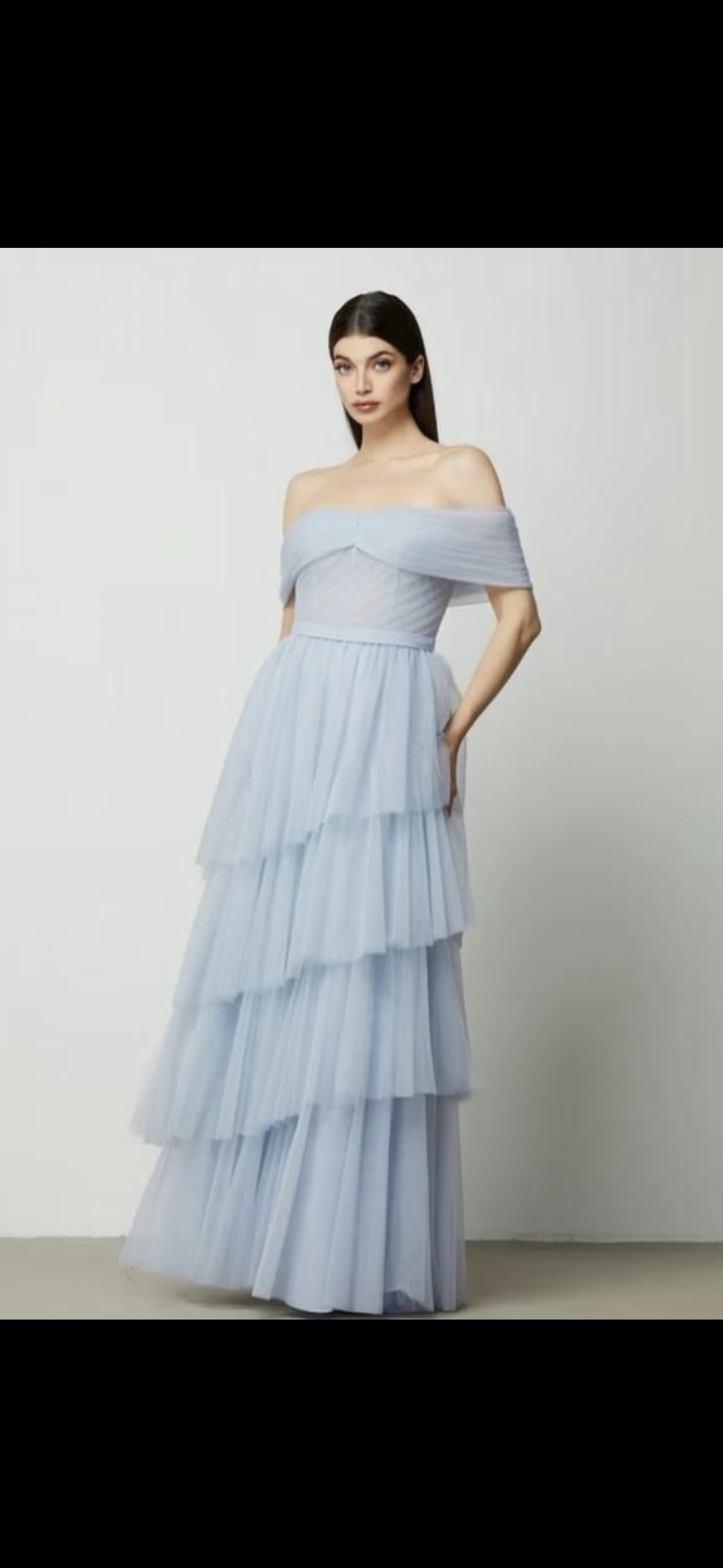 فستان سهرة راقي باللون الأزرق الفاتح ✨ تصميم أنثوي ناعم بطبقات تول تعطي إطلالة فخمة ومميزةتم لبسه مرة واحدة فقط، بحالة ممتازة جدًا بدون عيوب، وتم...